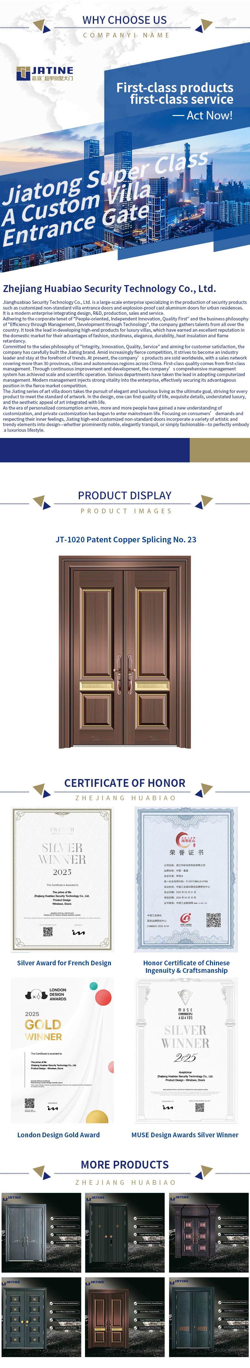 Com design profissional, qualidade confiável e suporte pós-venda completo, ajudamos os clientes a construir entradas de vilas seguras, elegantes e distintas. Nossos produtos são amplamente reconhecidos nos mercados internacionais por sua qualidade estável, design elegante e desempenho de alto custo, tornando-se uma escolha confiável para construção e modernização residencial de alto padrão.