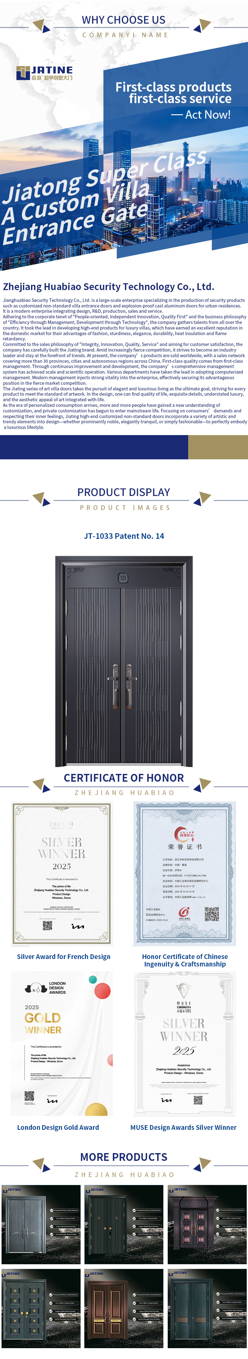Cada produto é projetado com materiais de alta resistência para garantir longa vida útil, estabilidade e resistência ao desgaste diário e às condições climáticas. Nossos designs de tamanho personalizado permitem uma combinação flexível com diferentes estruturas de vilas, criando um efeito de entrada coordenado e sofisticado. A série de alumínio fundido à prova de explosão apresenta construção sólida, excelente desempenho anti-intrusão e desempenho de segurança aprimorado, tornando-a a escolha ideal para famílias que buscam padrões de segurança mais elevados.
