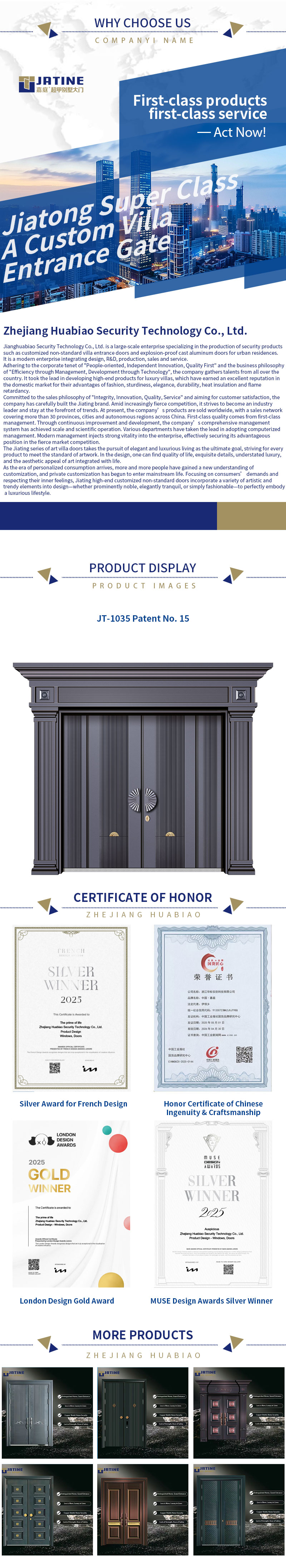 Com design profissional, qualidade confiável e suporte pós-venda completo, ajudamos os clientes a construir entradas de vilas seguras, elegantes e distintas. Nossos produtos são amplamente reconhecidos nos mercados internacionais por sua qualidade estável, design elegante e desempenho de alto custo, tornando-se uma escolha confiável para construção e modernização residencial de alto padrão.
